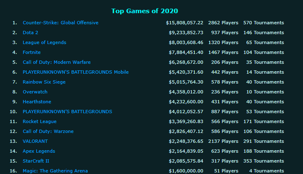 CS:GO заняла первое место среди киберспортивных дисциплин по сумме призовых, разыгранных на турнирах в 2020 году. Статистику предоставил портал Esports Earnings. На турнирах по CS:GO в 2020 году было разыграно почти $16 млн призовых. В Dota 2 этот показатель достиг $9 млн....
