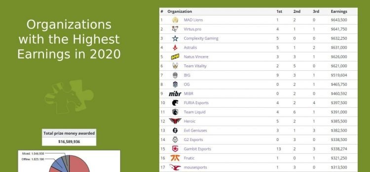 Авторитетный портал поделился заработком CS:GO-команд за 2020 год. В топ-3 входя неожиданные команды. MAD Lions на первом месте, Virtus.pro на втором, а Complexity на третьем.Еще интересная статистика, что в общем на турнирах по CS:GO было разыграно $16,589,936. На LAN-турнирах: $1,823,190,...