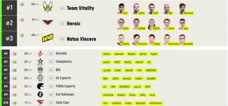 Natus Vincere обошли Astralis и заняли третье место в рейтинге команд по CS:GO от ESL. Лидером списка стала Team Vitality, которая сместила с этой позиции Heroic. Еще одна команда из СНГ — Virtus.pro — расположилась на 18-й строчке. Состав Дана apEX...