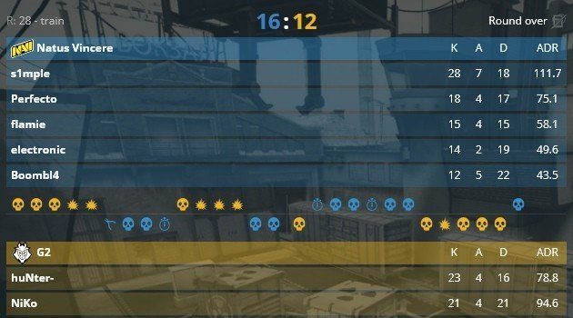 Natus Vincere победили у G2 Esports на второй карте - Train со счетом 16:12. Решающей картой за выход в гранд финал будет Nuke.G2 Esports 16:10 Natus Vincere @ Dust 2G2 Esports 12:16 Natus Vincere @ Train На этом турнире NAVI...