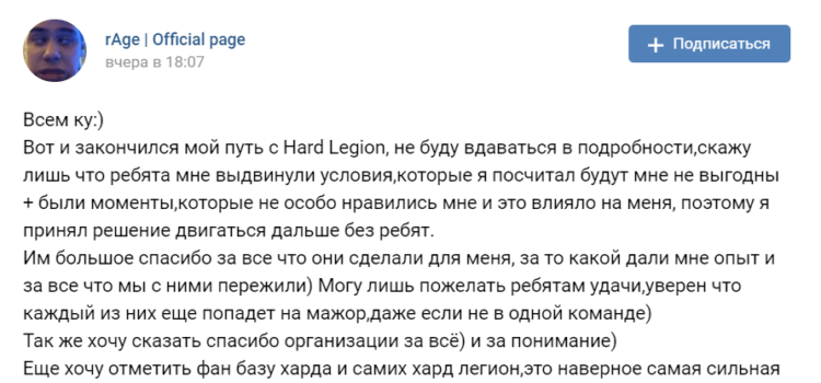 Вчера стало известно, что Дмитрий rAge Болотов больше не является частью Hard Legion. Он на своей странице во "ВКонтакте" решил рассказать о причинах такого решения. rAge отметил, что организация предложила ему условия, которые он посчитал не выгодными для себя, также...