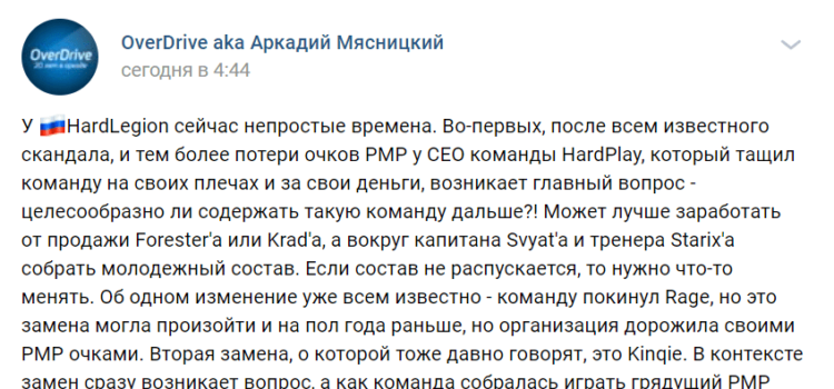 Инсайдер Алексей OverDrive Бирюков поведал о ситуации в какую попали Hard Legion. Буквально вчера они подтвердили уход из команды rAge, а также есть слух, что может уйти и Kinqie. OverDrive отметил, что в случае если уйдет Kinqie, то Hard Legion не...