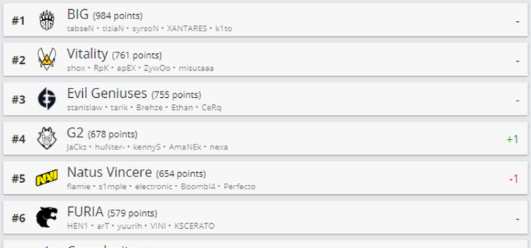 Natus Vincere уступили G2 Esports четвертую строчку в рейтинге HLTV.org. Состав из СНГ опустился на пятое место. Лидерами списка остались BIG, Team Vitality и Evil Geniuses. Fnatic потеряла два пункта и замкнула первую десятку лучших, уступив Team Liquid и Heroic. Astralis поднялась...