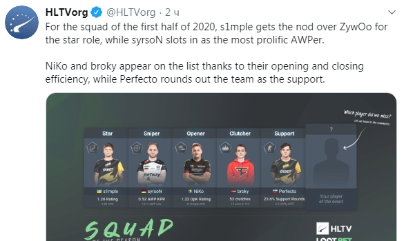 Два бойца коллектива Natus Vincere – Александр «S1mple» Костылев и Илья «Perfecto» Залуцкий вошли в состав «команды сезона» по результатам первой половины 2020 года от портала HLTV.org. Для команды первой половины 2020 года s1mple отдает дань ZywOo за роль звезды, в...