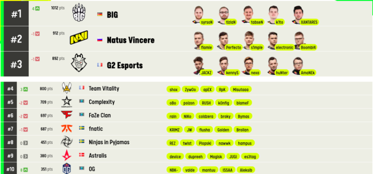 BIG поднялась на первое место в рейтинге лучших команд по CS:GO в мире по версии HLTV.org. Третью строчку заняли Evil Geniuses, которые прибавили пять пунктов. Предыдущий лидер списка — Natus Vincere — опустился на четвертую позицию. Несколько пунктов также потеряли G2 Esports,...