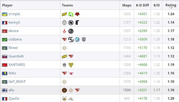 Игрок состава Natus Vincere по CS:GO Александр s1mple Костылев возглавил рейтинг HLTV.org по разнице убийств и смертей в профессиональных матчах. Он превзошёл прошлого лидера Кэнни kennyS Шраба — украинец опережает его на 28 пунктов. S1mple показал такую статистику за 1...