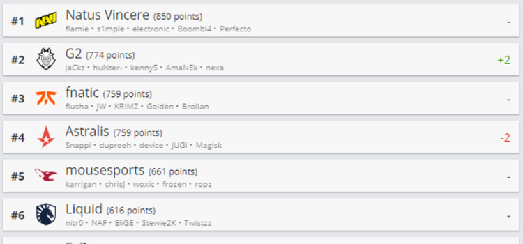 Astralis потеряла два пункта и заняла четвертое место в рейтинге лучших команд по CS:GO в мире по версии HLTV.org. Вторая строчка списка досталась G2 Esports, которая прибавила две позиции. Других изменений в первой десятке рейтинга не произошло — Natus Vincere...