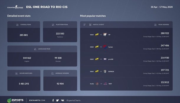 Наибольший онлайн на трансляции ESL One: Road to Rio по CS:GO для СНГ был зафиксирован во время матча группового этапа между Natus Vincere и Virtus.pro. Статистику предоставил Esports Charts. За поединком между VP и NAVI в пике следили почти 286...
