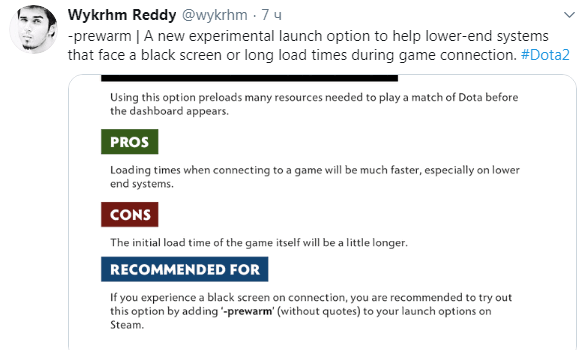 Valve добавили в Dota 2 новый параметр запуска «-prewarm», который должен значительно ускорить подключение к матчам на слабых ПК. Подробнее о нововведении рассказал инсайдер Викрам Редди на своей странице в Twitter. -prewarm | Новая экспериментальная опция запуска, чтобы помочь слабым системам, которые...