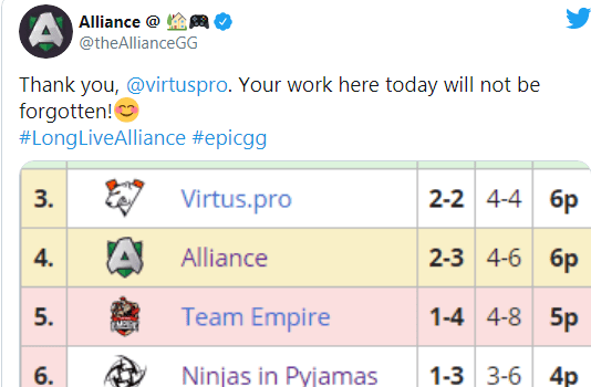 Alliance поблагодарили команду Virtus.pro в твиттере за свой выход в плей-офф Beyond Epic. VP так же вышли в плей-офф турнира, хоть и проиграли команде NiP со счётом 1:2 в последнем матче. Однако, благодаря тому, что Virtus.pro всё же забрали одну карту, Alliance опередили NiP по...