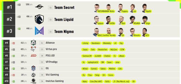 ESL обновили рейтинг команд по Dota 2. Как и прежде лидером списка с большим отрывом по очкам являются Team Secret (1290). Коллектив Nigma (448) вошёл в топ-3 и дышит в спину команде Liquid (496). Virtus.pro и VP.Prodigy сохранили свои пятое и седьмое...