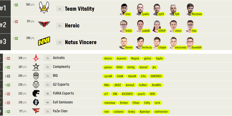 Natus Vincere обошли Astralis и заняли третье место в рейтинге команд по CS:GO от ESL. Лидером списка стала Team Vitality, которая сместила с этой позиции Heroic. Еще одна команда из СНГ — Virtus.pro — расположилась на 18-й строчке.